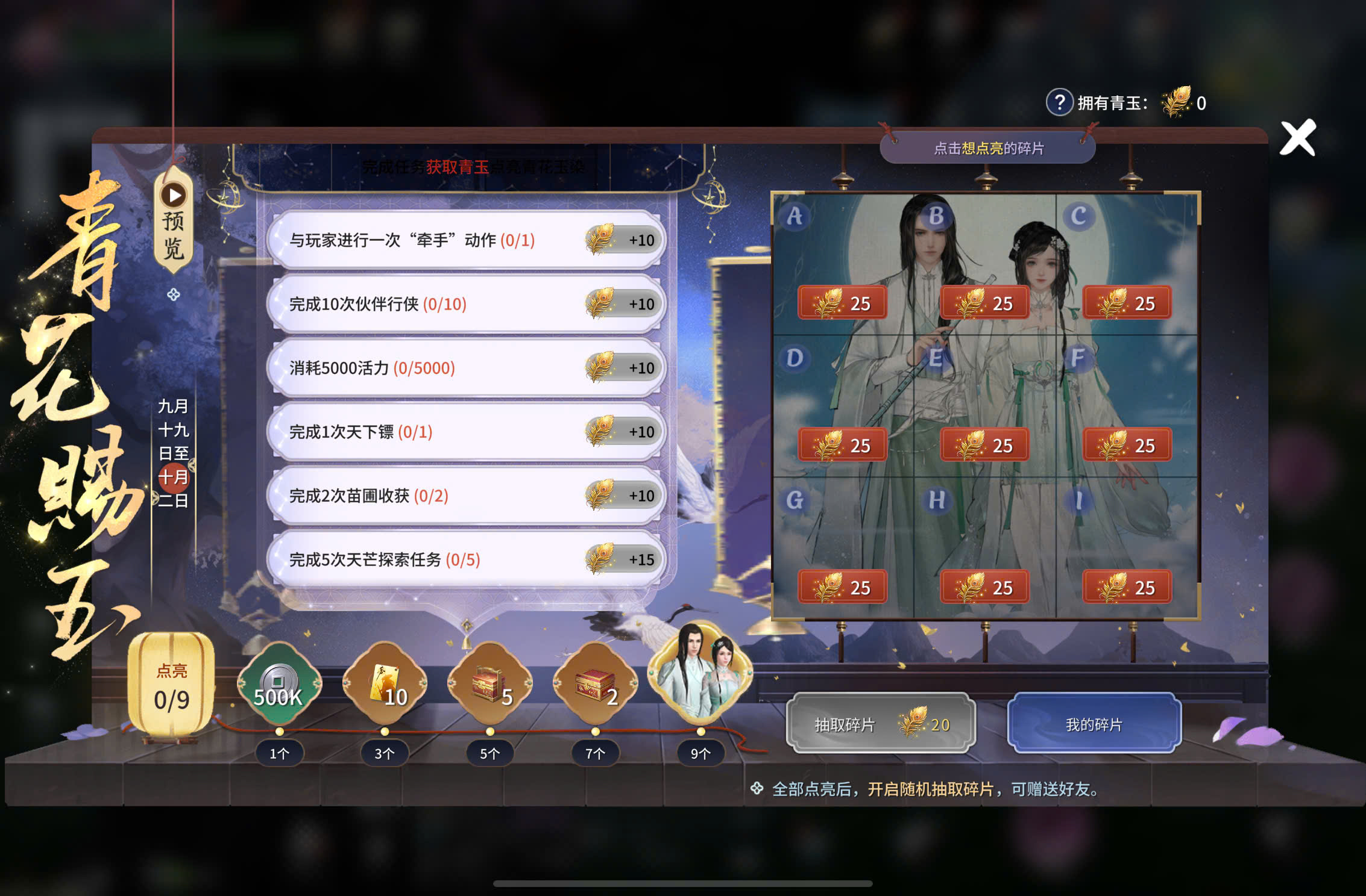 青花赐玉活动介绍 19/09/2024 亲爱的少侠,一起来解任务,获得免费时装-青花玉染吧! 📌 活动时间: 9/19-10/2 📌 参与条件: 等级35以上,可从主界面"送時裝”入口参与活动。 📌 活动规则: 1.完成活动指定任务可获得"青玉", 使用青玉可点亮盘面。 2.当所有盘面点亮时,即可获得专属时装! 3.所有盘面点亮后,剩馀的青玉可用来抽取盘面碎片,碎片可以用来赠送给好友,帮助他们点亮盘面。 4.每位角色最多可以收到三个赠送的碎片。