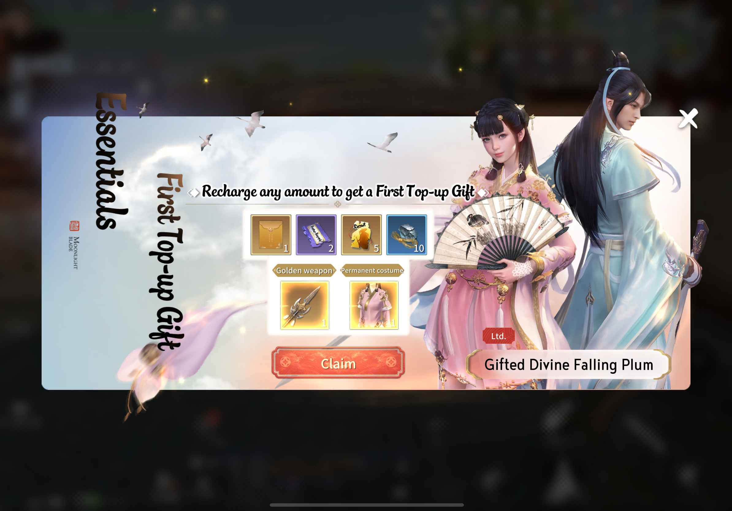 Embark on your journey of Jianghu and receive gifts for newbies! Recharge any amount to receive a deluxe newbie gift worth 52 USD, including costumes like " Divine - Falling Plums", sect-specific golden weapons, Bound Ticket red packets, and a wealth of growth materials to help young hero get started!