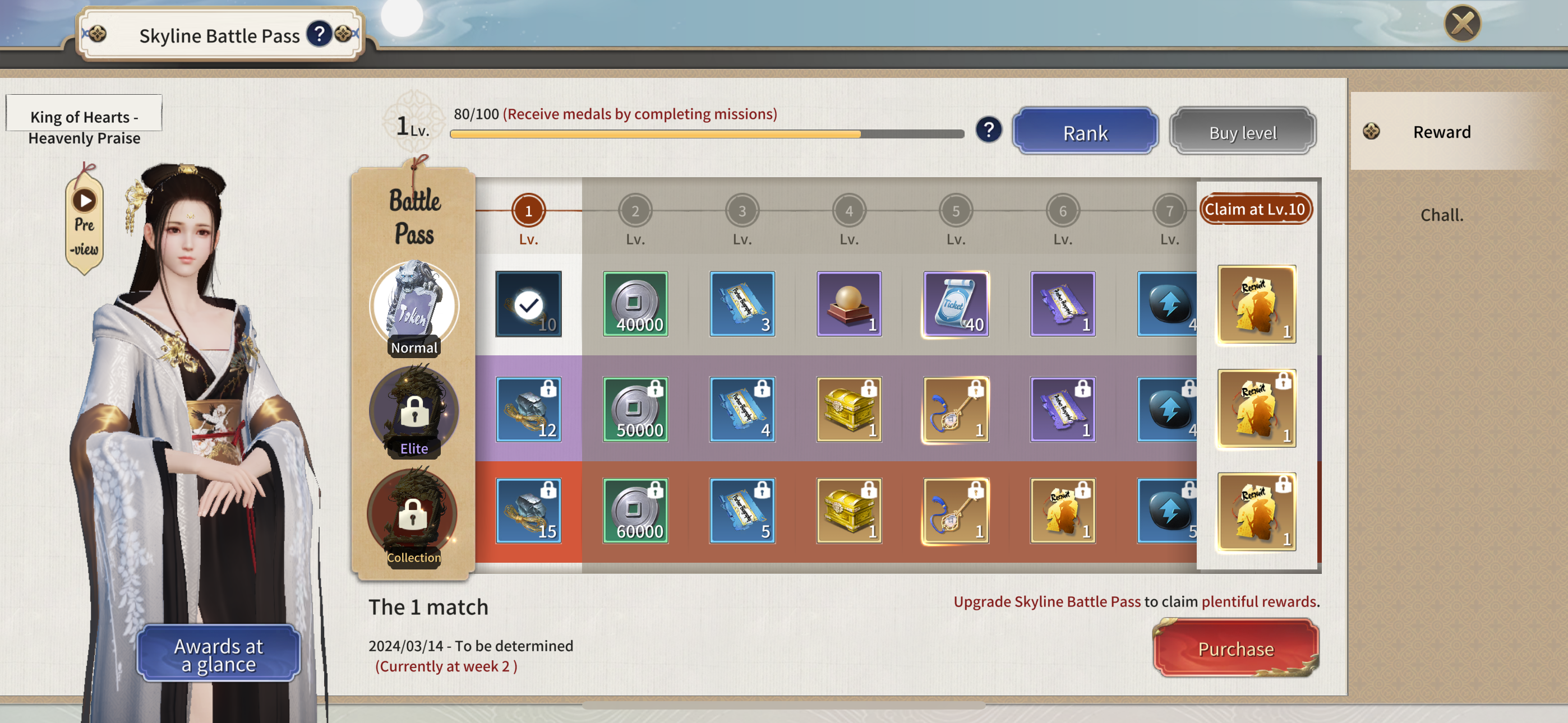 Participate in the Skyline Battle Pass and complete challenge tasks to earn task medals. Accumulate these medals to upgrade your Battle Pass level and receive rewards, including a massive amount of bound Tickets, numerous items, and the back accessory "Xiao Yanran"! The limited exclusive “King of Hearts - Heavenly Praise” suit awaits you!