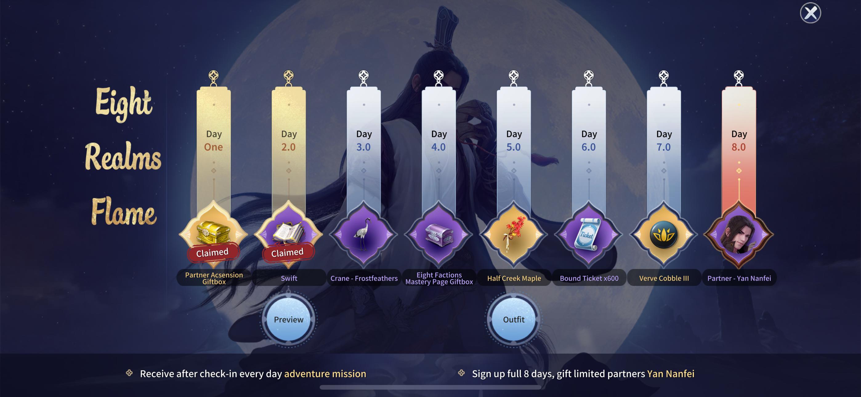 As the Eight Realms Flame ignites, receive the Hero Summon Order upon first day login, the Grand Drift "Swift" on the second day, and the back accessory "Half Creek Maple" on the fifth day. By logging in on the eighth day, obtain the partner "Yan Nanfei"!
