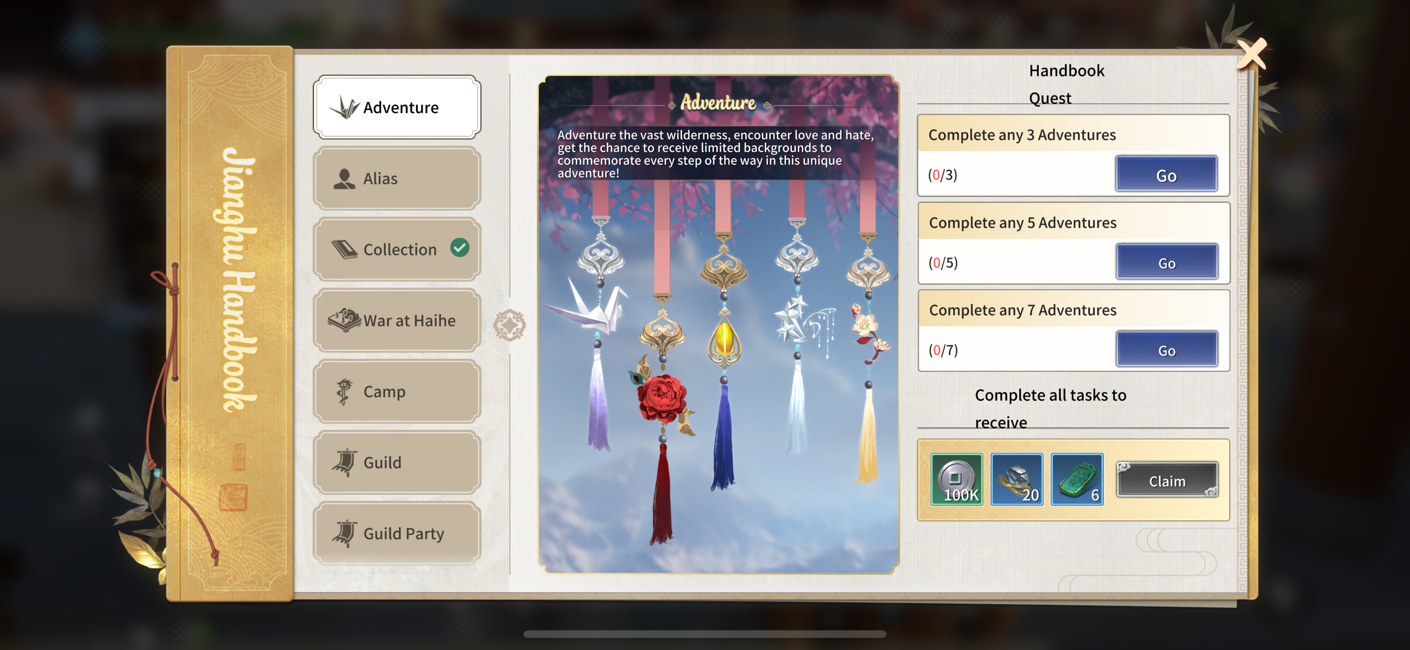 Unsure of where to go in the martial arts world? Unsure how to enhance your weaponry? Unsure how to find Guilds or friends? The Jianghu Handbook is here for all heroes! It will guide you through every aspect of the martial arts world, and completing its tasks will reward you with a substantial amount of Bound Tickets, silver fragments, and growth materials. So, please make the most of this invaluable resource!