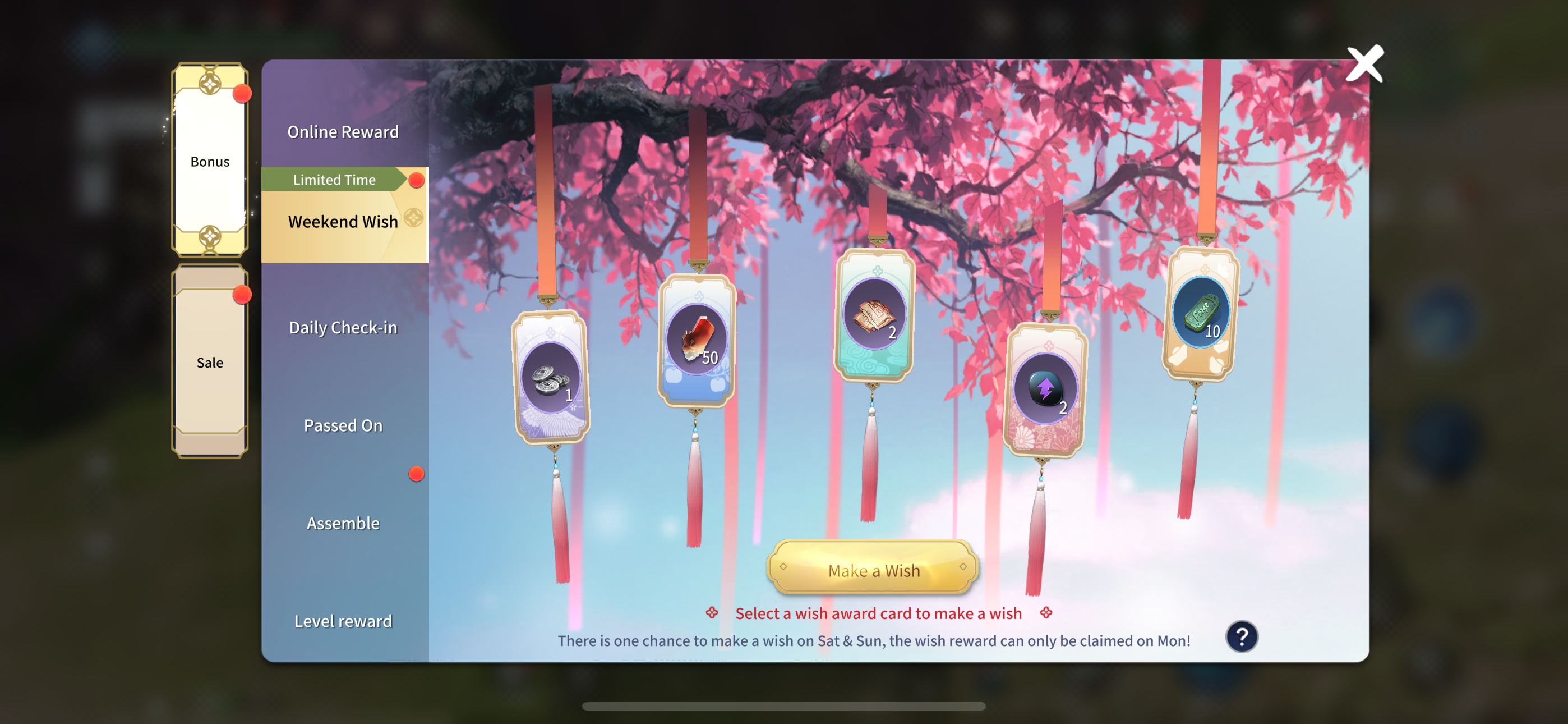 Every Saturday and Sunday, the heroes can make two wishes during the weekend. Wish items including Exquisite Mastery Shard, Divine Will, and precious items like Celestial Stone. Your wishes will come true on Monday, so make sure not to miss them!