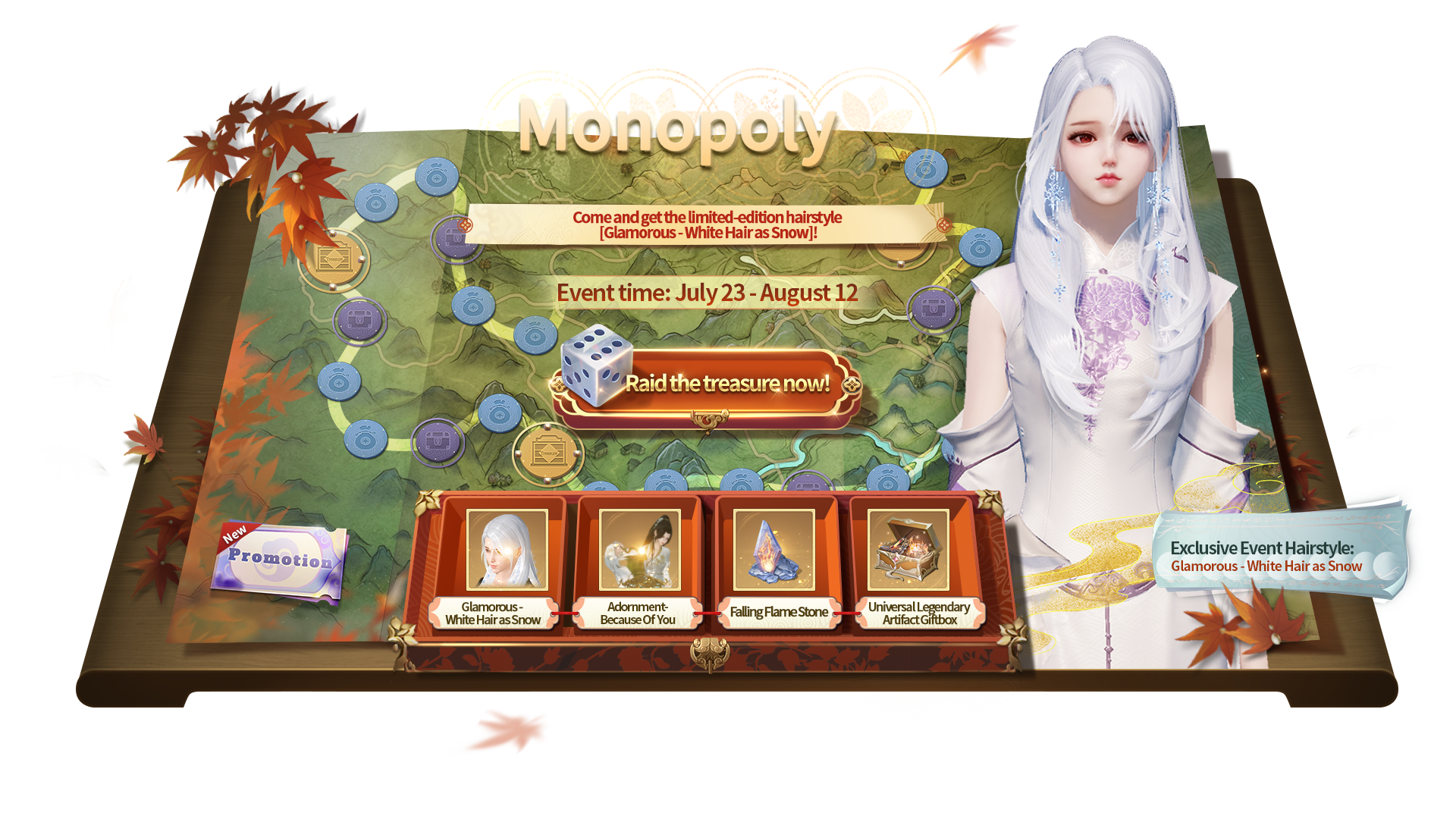 Dear heroes, Monopoly Season 4  officially begin on July 23th.  By participating in the event, you have a chance to obtain new Exclusive Event Hairstyle "Glamorous - White Hair as Snow", as well as numerous rare materials essential for power boosting, such as "Skybound Token V", " Falling Flame Stone ", “Universal Legendary Artifact Giftbox”..etc!