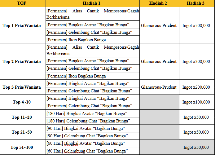 *** Top 1-3 akan menerima hadiah terpisah untuk pria dan wanita (total 6 partisipan), dan top 4 – 100 akan menerima hadiah berdasarkan peringkat tanpa memandang kategori jenis kelamin.
