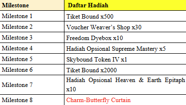 - Hadiah Online In-Game: Tetap online selama 30 menit untuk menerima Divine Will x5 + Bunga Elegan x1. Tetap online selama 50 menit untuk menerima Exquisite Mastery Shard x2 + Bunga Elegan x3.