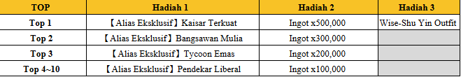 - Undang teman, keluarga, atau anggota member untuk memberikanmu vote. Partisipan dengan jumlah vote terbanyak di semua server akan menerima hadiah luar biasa (bisa merujuk ke daftar hadiah Top Ranking Semua Server).